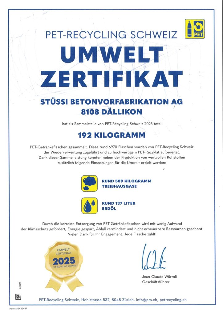 STÜSSI reduziert den CO₂-Fussabdruck durch eine moderne Produktionsinfrastruktur, effizientere Abläufe und klinkerärmere Betonrezepturen. Restbeton verwertet STÜSSI intern weiter; Wertstoffe wie Holz, Metall, Aluminium und PET werden getrennt gesammelt und lokalen Recyclingbetrieben zugeführt.